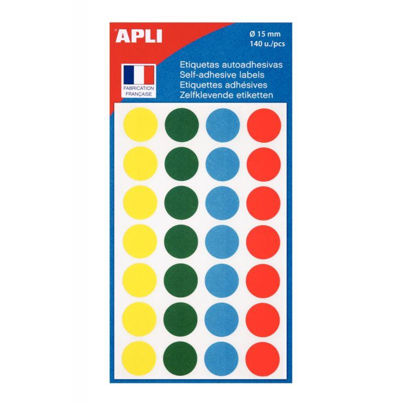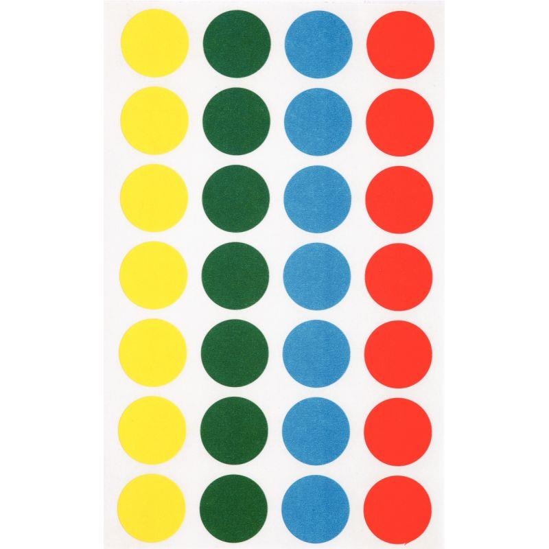 Etui de 140 pastilles de couleur diam?tre 15mm coloris assortis. Bleu, rouge, jaune, vert. Id?ales pour la codification, le classement et le rep?rage. Ecriture manuelle possible.