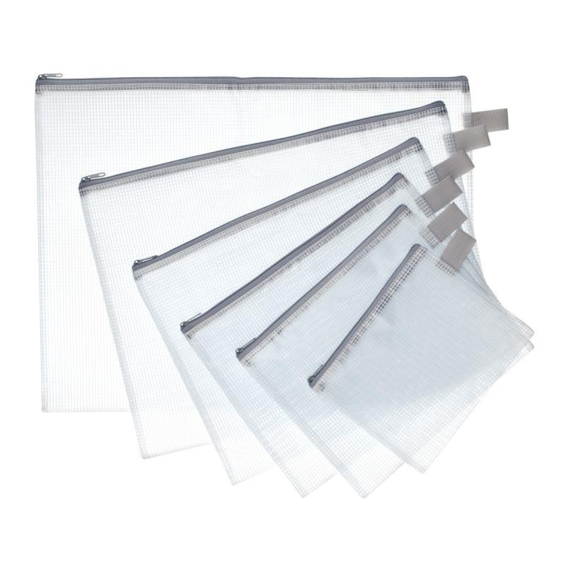 Pochette zipp?e 17,5×21 cm en PVC renforc? semi-transparente. Zip gris.