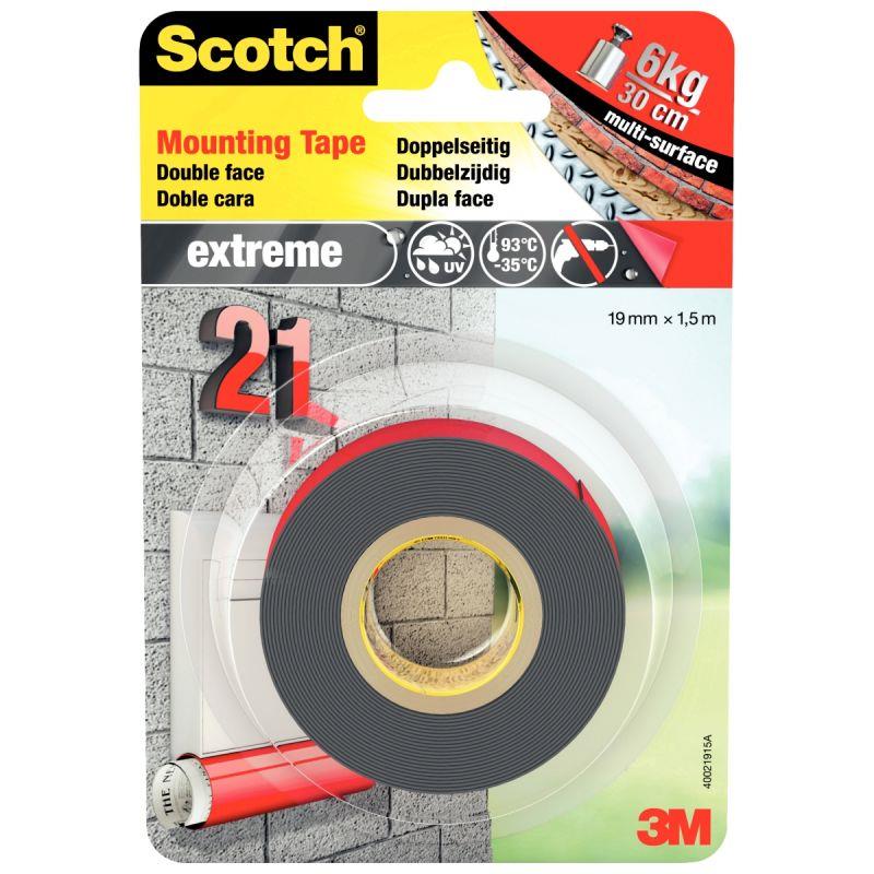 Rouleau de fixation double face extra fort Scotch, 19mm x 1,5m. Mousse adh?sive de fixation double face pour usage int?rieur et ext?rieur. Permanent et durable, tient jusqu’? 6 kilos.